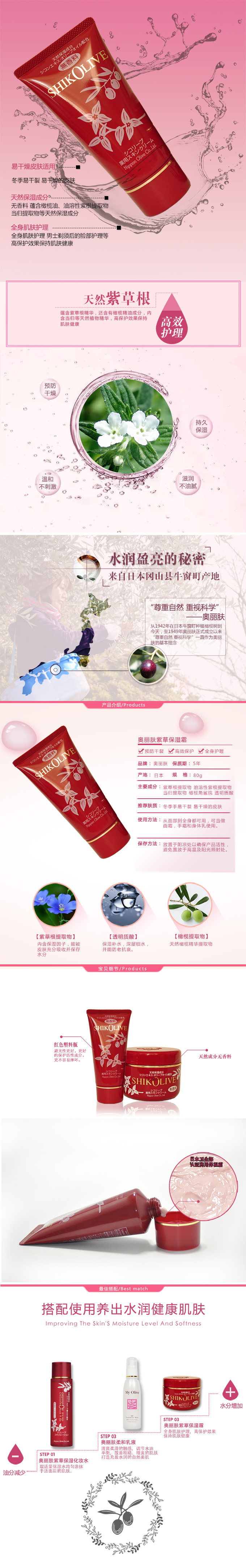 成分:紫根提取物、当归提取物、橄榄油 简介:本品可改善皮肤粗糙、针对晒伤、湿疹、皲裂等皮肤问题,从面部到全身都可以用,本品無香料・無着色・無防腐剂。(本品颜色为紫草颜色,不含色素请放心使用) 使用方法:用于在化妆水之后,取适量涂抹于面部或全身! 规格:正常规格 适合肤质:任何肤质