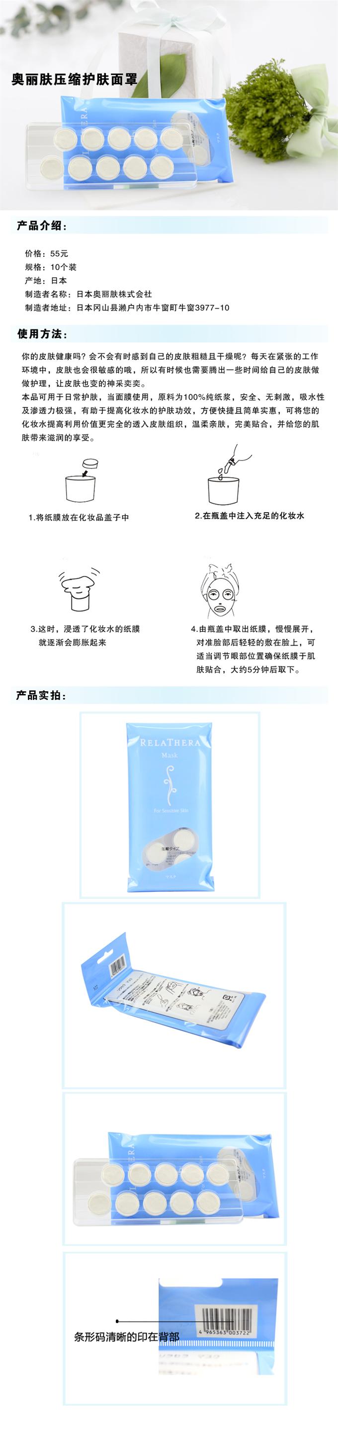 使用方法:将压缩的面罩取出后放在手心上用化妆水浸泡。面罩会自动膨胀,打开后贴于面部,待面罩干了取下来即可。