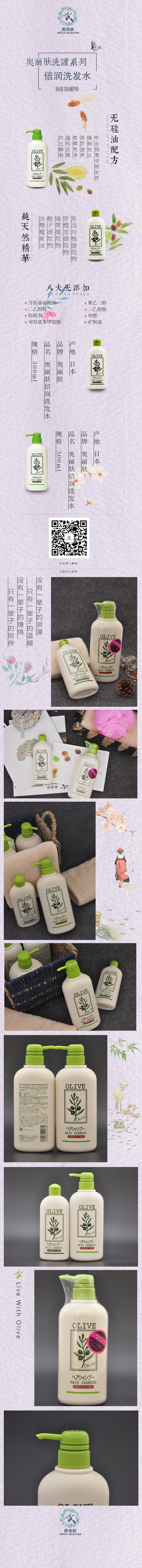 成分:橄榄洗发露天然保湿成分中含橄榄、当归、栀子等植物精华 功效:深层修复秀发,帮助改善枯黄干燥、分叉发质,有效的去屑。保持健康的头皮和强韧的发质,带给头发滋润、亮泽、弹力、浓密。低刺激性,可以每天使用的柔和洗发水。